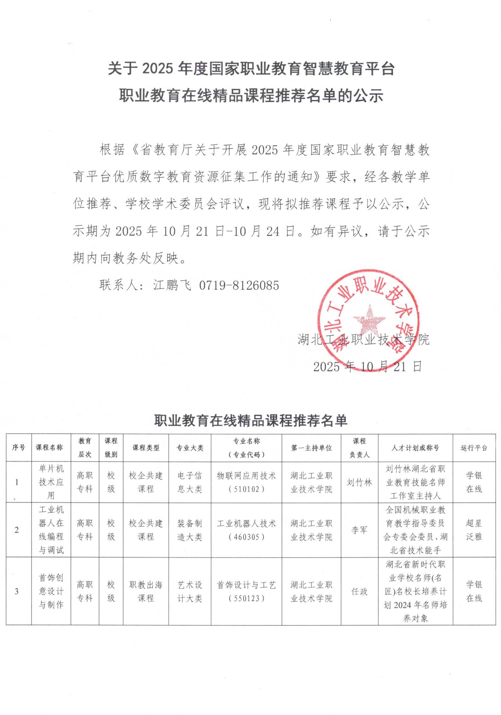 关于2025年度国家职业教育智慧教育平台职业教育在线精品课程推荐名单的公示